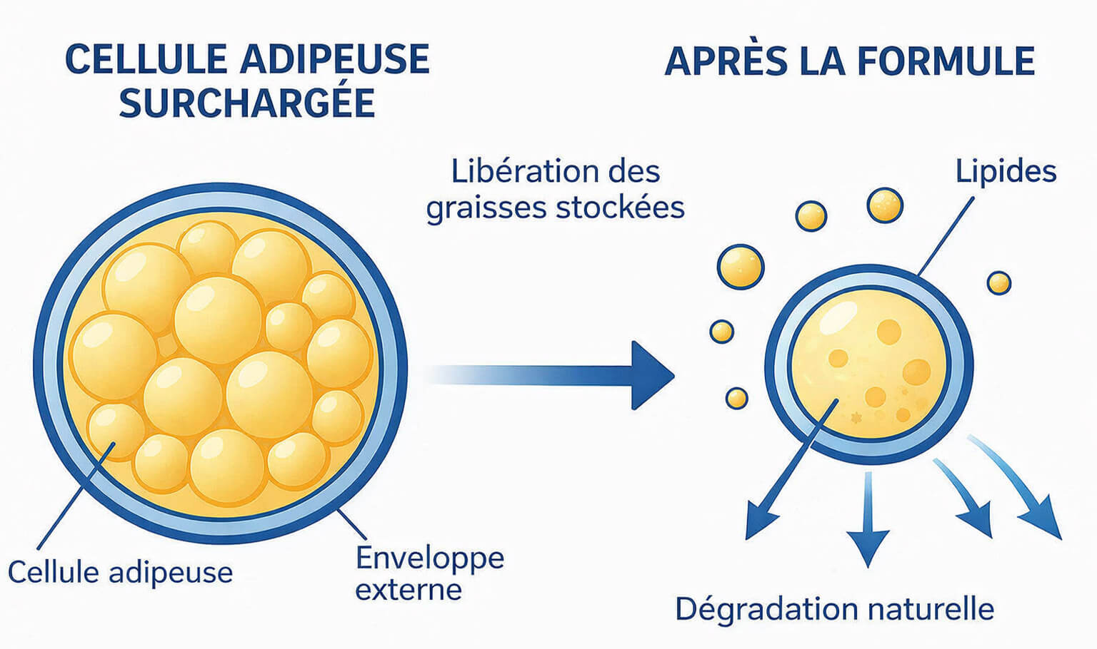 La formule dissout spécifiquement l’enveloppe externe des cellules graisseuses surchargées, permettant au corps d’éliminer et de brûler naturellement les graisses stockées – sans ralentir le métabolisme comme c’est le cas avec les injections.